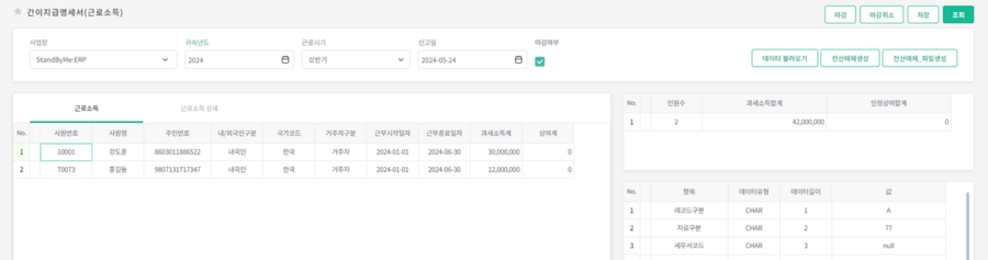 - 신고일을 선택하고 [마감] 버튼을 누르면 해당 근로소득 내역이 마감됩니다.
