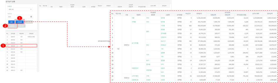 1.감가상각 대상월 행 선택 후, 감가상각 실행