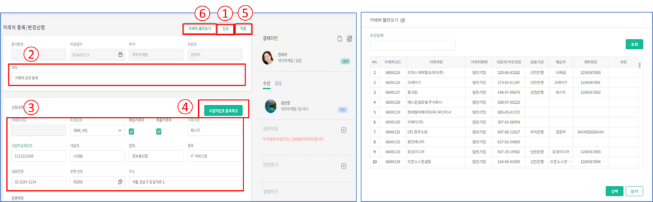 6.변경을 할 경우 거래처를 우측 화면에서 선택 후 저장, 상신을 합니다.