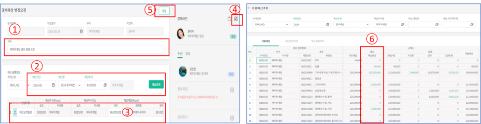 예산기간, 예산명, 예산처에 따라 경비예산을 변경 요청을 하는 화면입니다.
