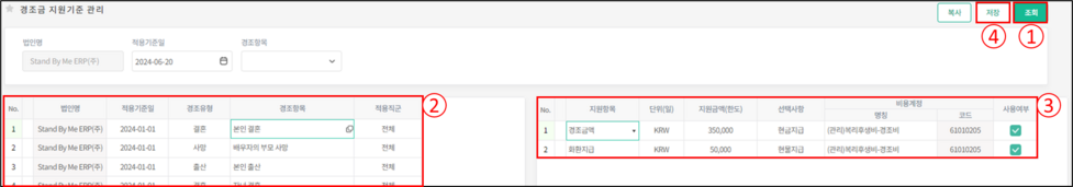 1.조회 조건을 입력하고 [조회] 버튼을 눌러 경조금 지원 기준을 조회합니다.