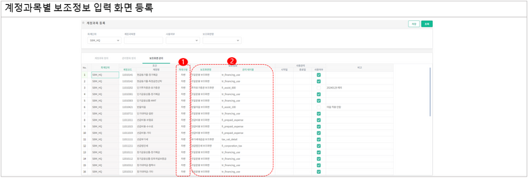 2. 계정별 전표에서 사용할 보조화면 지정 (보조화면 설정 시, 전표 입력에서 해당 계정으로 등록하면 지정된 보조화면 팝업실행)