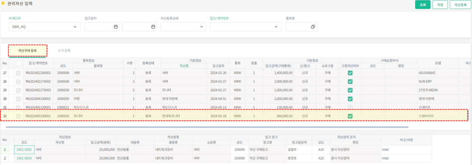 ※ 입고처리가 완료 되면 “관리자산 입력“ 프로그램에서 등록한 관리자산 확인 가능