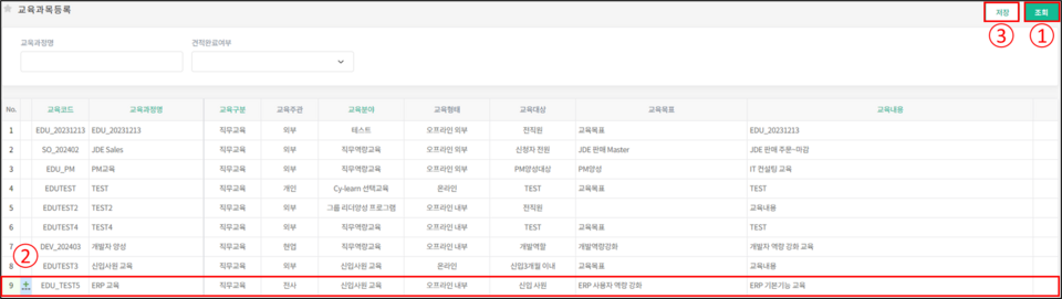 2.교육 과목 정보를 수정하거나, 행을 추가하여 신규 정보를 등록합니다.