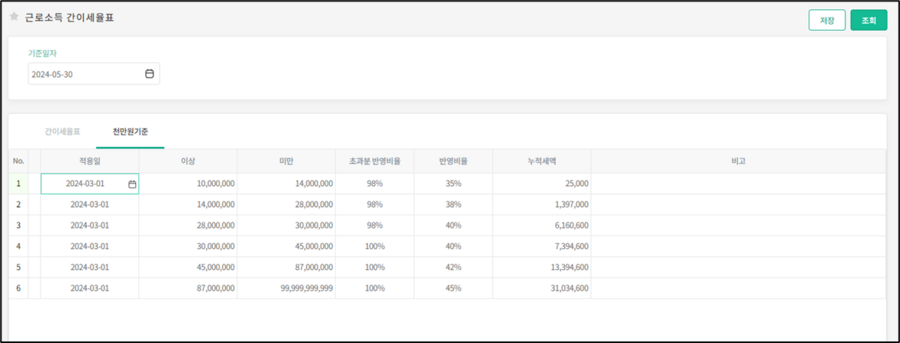 - 천만원기준 탭에서 천만원 초과분에 대한 반영 비율 및 누적세액을 등록할 수 있습니다.