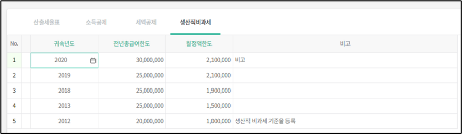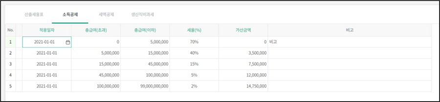 기준일자 별로 산출세율표/소득공제/세액공제/생산직비과세 정보를 관리하는 화면입니다.