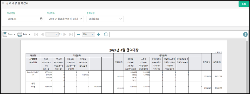 지급년월 및 지급차수, 출력유형을 선택하고 조회 시 출력유형별로 다른 출력물을 조회할 수 있습니다.