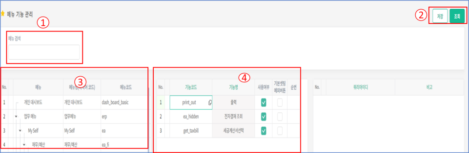 조회 결과에 따라 3번 메뉴를 선택을 하면 4번에서 기능들이 조회가 되며 사용여부 순번을 지정을 할 수 있습니다.