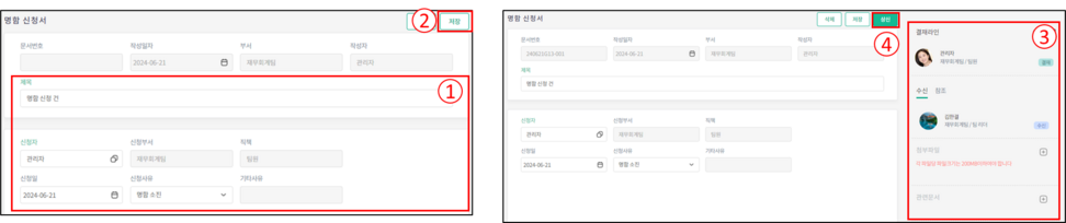 *저장 시 오른쪽 그림과 같이 [상신] 버튼이 활성화 됩니다.