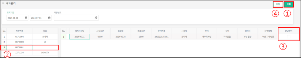 1.조회 조건 입력 후 [조회] 버튼을 눌러 차량 배차 내역을 조회합니다.