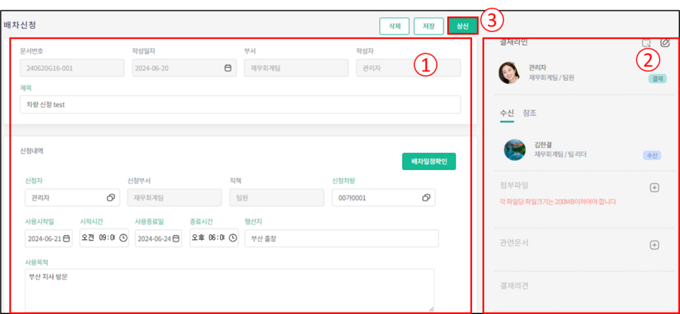법인차량 배차신청을 등록하고 결재요청을 하는 화면입니다.