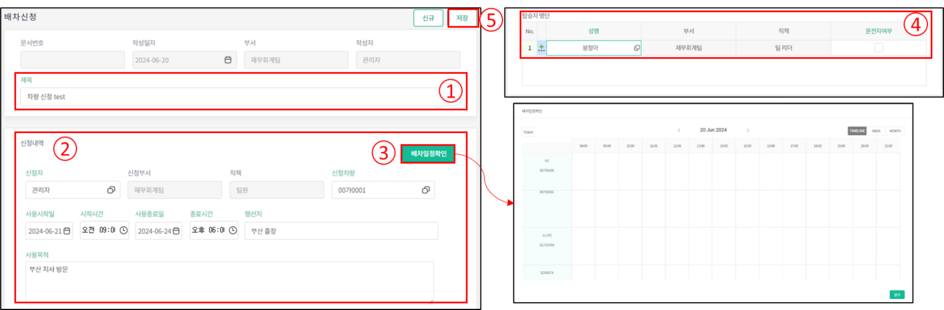 5.저장 버튼을 눌러 배차신청서를 저장합니다.