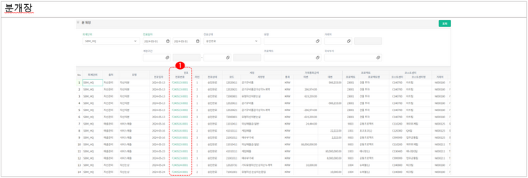• 전표번호 클릭 시, “전표세부조회"로 전표 세부내용 확인 가능