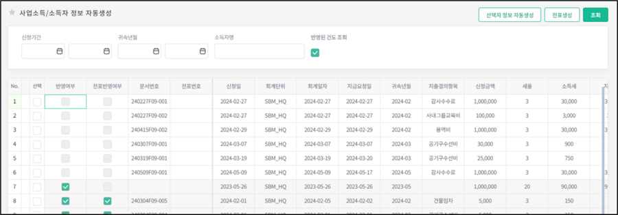 • 지출결의서(사업소득)에서 상신한 내역을 조회하고 사업소득 자료에 반영 및 전표 생성하는 화면입니다.