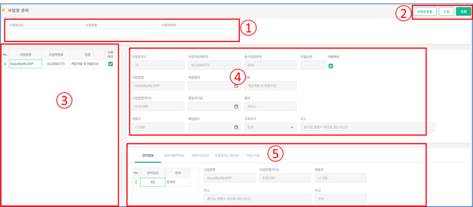 사업장 정보를 관리 화면으로 추가 수정 가능 한 화면입니다.