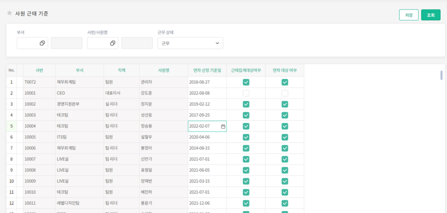 1. 사원 목록이 조회되며 연차산정 기준일 및 근태 집계대상여부, 연차 대상여부를 설정할 수 있습니다.