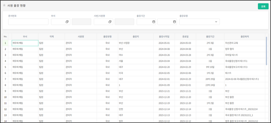 사원 출장 현황 화면 에서 결재한 내역을 조회할 수 있습니다.