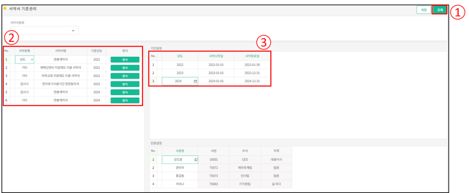 1.조회 조건 입력 후 [조회] 버튼을 눌러 서약서 기준을 조회 합니다.