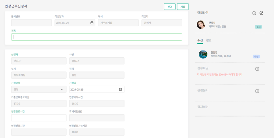 연장근무 신청 시간 및 사유를 관리할 수 있습니다.