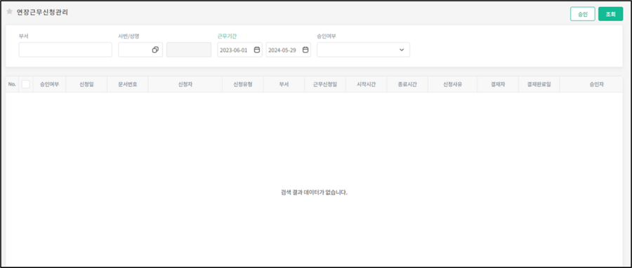 연장근무 신청서에서 상신 및 결재한 근태 내역을 조회할 수 있습니다.