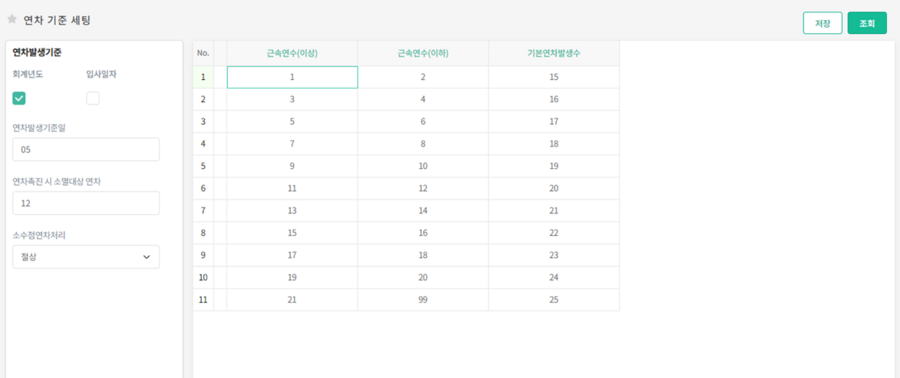 연차발생 기준 및 근속연수에 따른 기본 연차 발생 일수를 관리할 수 있습니다.