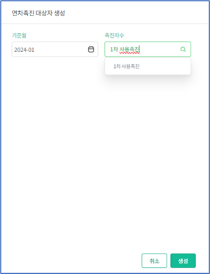 - 기준월, 촉진차수를 선택하고 [생성] 버튼을 누르면 해당 월의 대상자가 자동으로 생성됩니다.