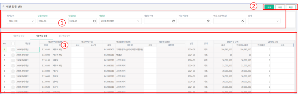 왼쪽에 체크 박스에 체크를 한 후 확정을 누르면 예산이 전용이 됩니다.
