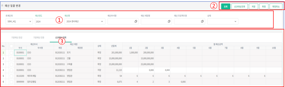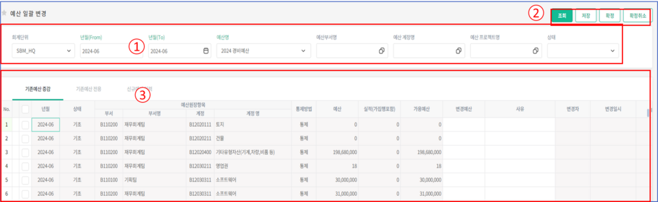 왼쪽에 체크 박스에 체크를 한 후 확정을 누르면 예산이 증감이 됩니다.