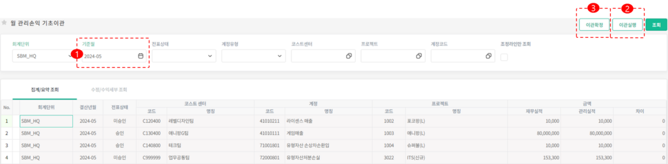 월 관리손익 기초이관