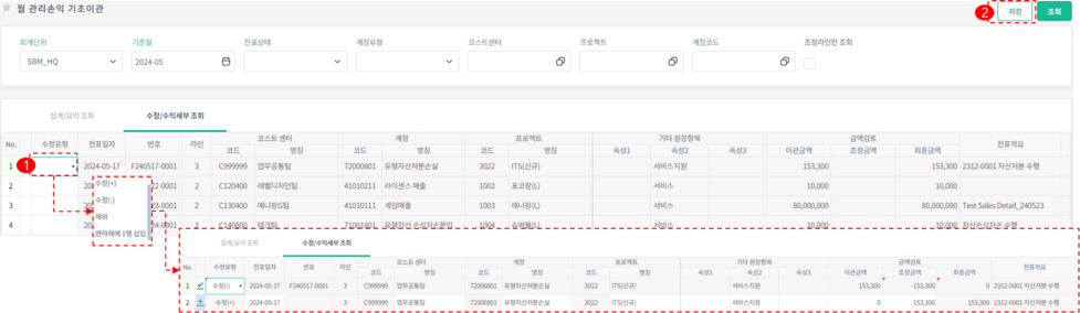 1.-① 수정(+) / 수정(-) : 수정(-) 버튼을 클릭하면 선택한 레코드와 똑같은 레코드가 바로 밑 하단에 금액만 (-)의 금액으로