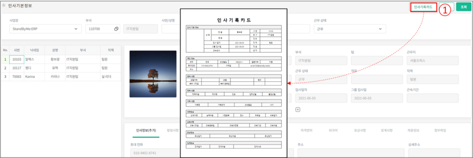 1.[인사기록카드] 버튼을 눌러 조회 및 출력할 수 있습니다.