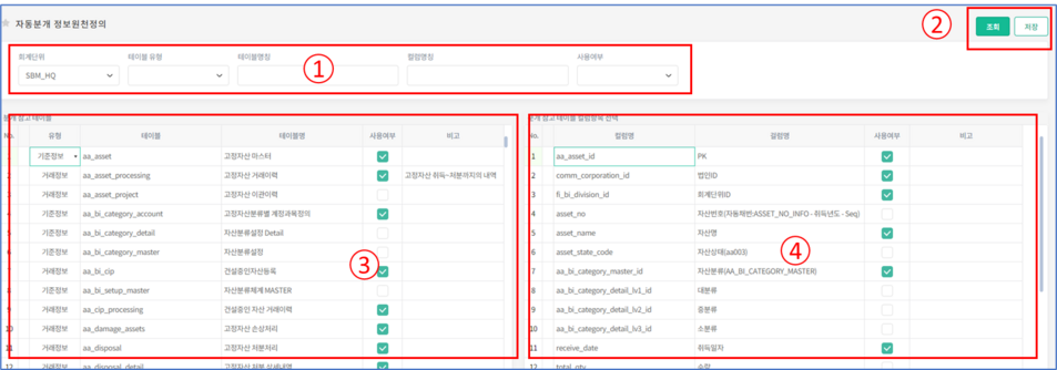 1.회계단위, 테이블유형, 테이블명칭, 컬럼명칭, 사용여부를 선택합니다.