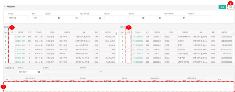 가수금 입금 처리한 가수금 선택 후 반제처리 할 채권을 선택