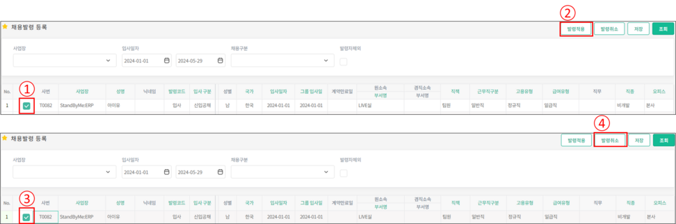 2.[발령적용] 버튼을 눌러 선택한 인원을 발령합니다.