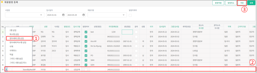 2.추가된 행에 채용발령 정보를 입력합니다.