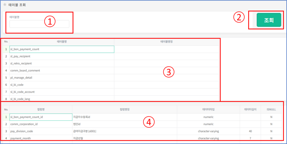 3번의 테이블을 선택을 하게 되면 4번에서 컬럼의 정보가 나옵니다.