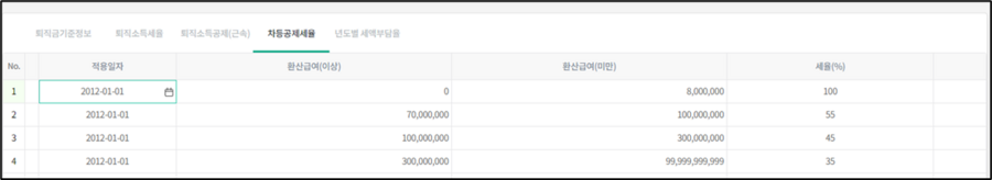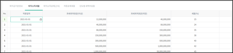 • 퇴직금 기준정보/ 퇴직소득세율/퇴직소득공제/차등공제세율/년도별 세액부담율을 관리하는 관리자용 화면입니다.