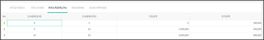 1. 각 퇴직소득 기준정보 항목별로 내역 추가 시 우클릭 > 행추가 하여 항목을 추가 및 수정합니다.