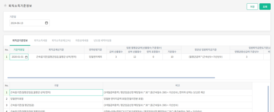 퇴직 > 퇴직소득기준관리 > 퇴직소득기준정보
