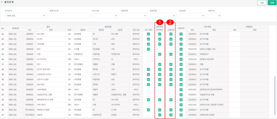 2.   품목 등록 시, 관리속성의 고정자산 체크하면 해당 품목을 관리자산으로 등록 시,