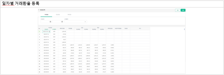 * 일자별 거래환율 등록 메뉴 : 은행과의 연동을 통해 거래환율 Update 가능