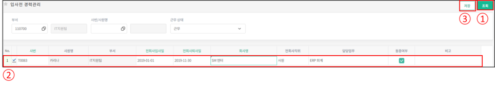 1.조회 조건 입력 후 [조회] 버튼을 눌러 조회합니다.2.‘전회사 입사일’, ‘회사명’ 등의 입사전 경력 정보를 입력/수정 합니다.3.[저장] 버튼을 눌러 저장합니다. | |||